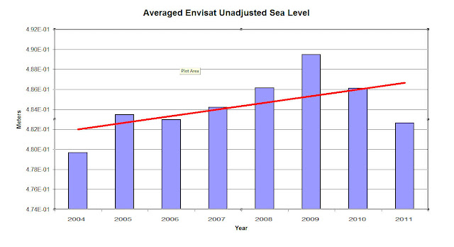 The Envisat data set is currently so short it is difficult to tease out any really significant conclusions. But I’m sure that is precisely why Goddard favours it. The real story of sea level rise can be obtained for the same web site this data comes from, which Goddard ignores, and the overall and continuing trend is obvious for all but the closed minded to see.